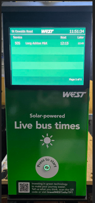 This Real Time Information Display is new to the West of England Mayoral Combined Authority region. It is a battery powered, solar charged information display which uses the latest innovations in solar technology.