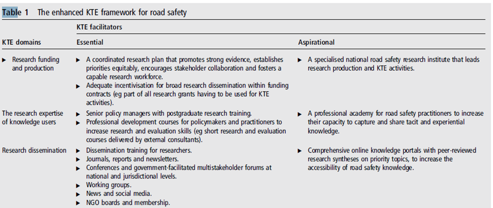 However, with a small number of exceptions, KTE has been infrequently examined in the road safety literature and is largely neglected by transport policy agencies. Considering the millions of deaths and injuries caused by road trauma each year, KTE has a critical role for enabling effective policy and practice, and the impending transformation of the road safety field overcoming decade. A study aimed to generate a framework to enhance KTE in road safety and encourage evidence-informed policy and practice, identifying KTE facilitators.[1]