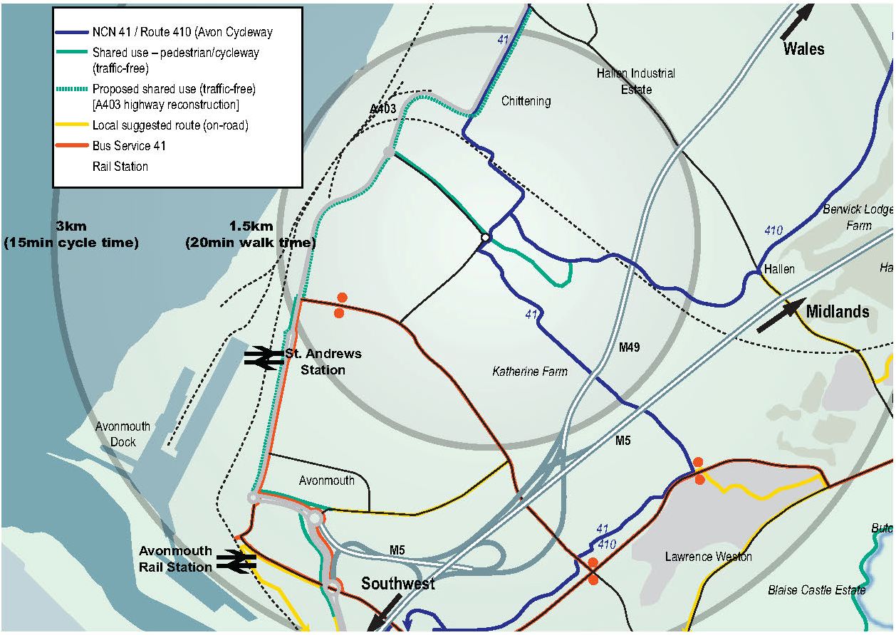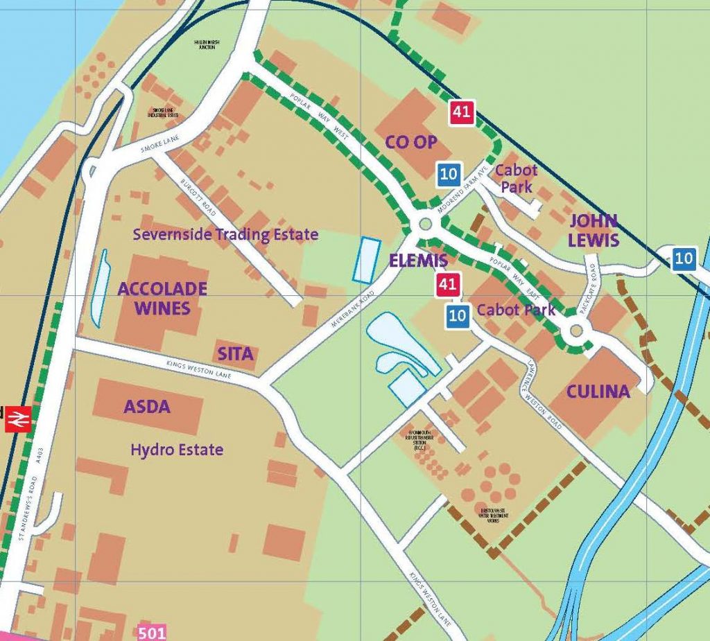 The majority of the route to Bristol City Centre via Avonmouth is along Portway. Route 410 (also known as the Avon Cycleway) links to the National Cycle Route 41 to the north-west of Cabot Park.