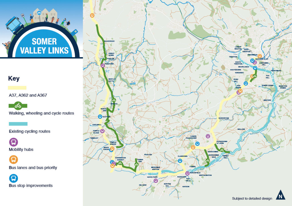 The project covers an area from Whitchurch southwards through Pensford, Clutton, Temple Cloud and Farrington Gurney, then moving through the Somer Valley (Midsomer Norton, Radstock and Peasedown St. John) and northwards towards Bath via Odd Down and A367 Wellsway.