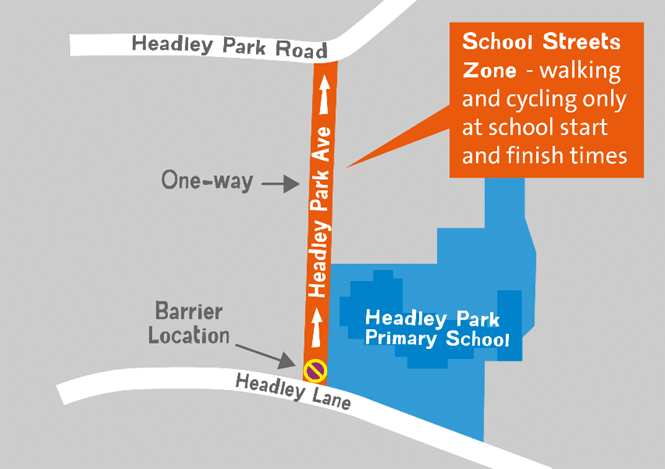 Vehicles are not be permitted to enter the zone for 35 minutes in the morning between 8:15 and 8:50 and 40 minutes in the afternoon between 2:45 and 3:25. Emergency vehicles, Blue Badge holders and residents of the affected section of Headley Park Avenue are exempt from these restrictions.