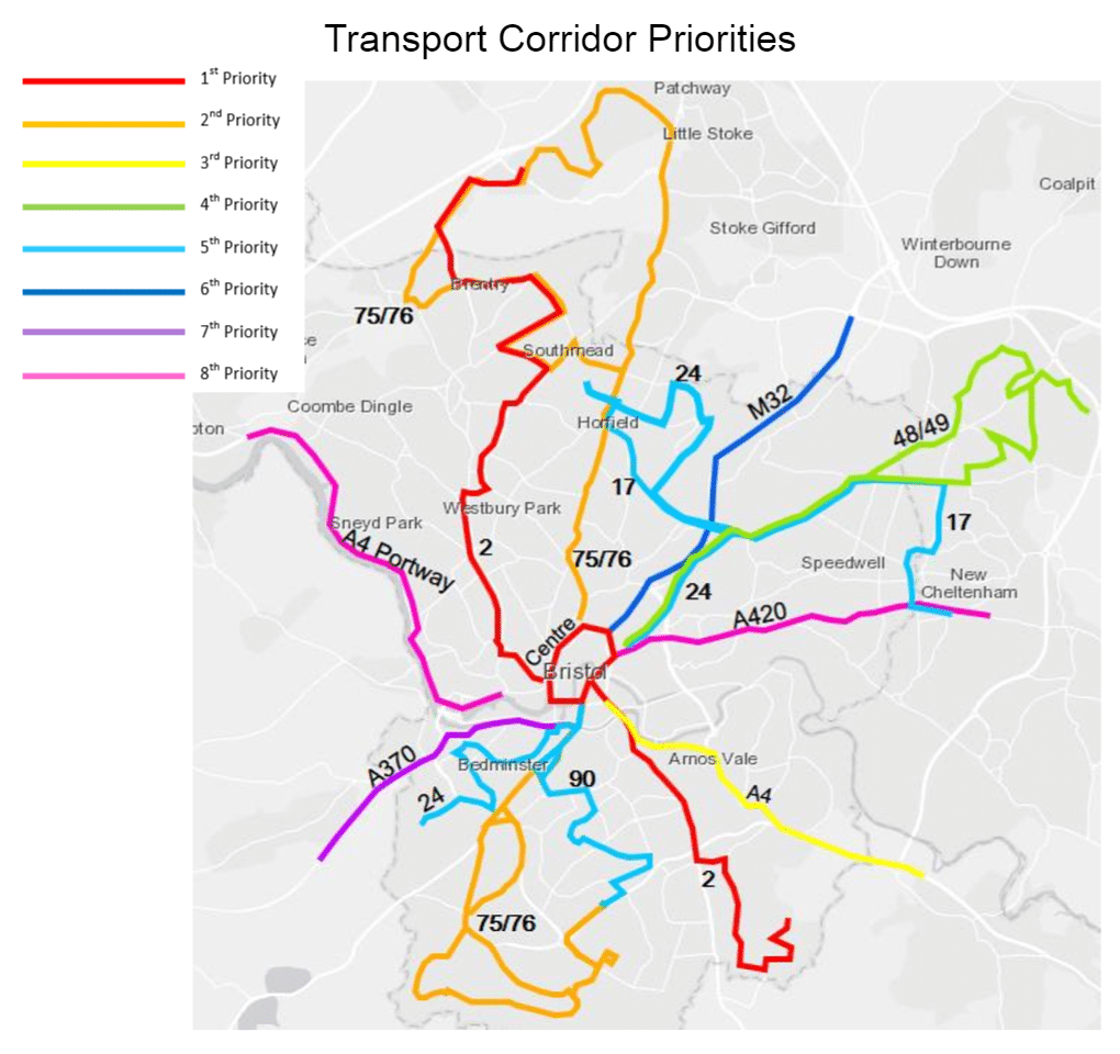 • 5th Priority is the light blue route – Southmead through Eastville to Ashton Vale which follows the no 24 bus route and Hengrove through Filwood Park to the Centre which follows the no 90 bus route