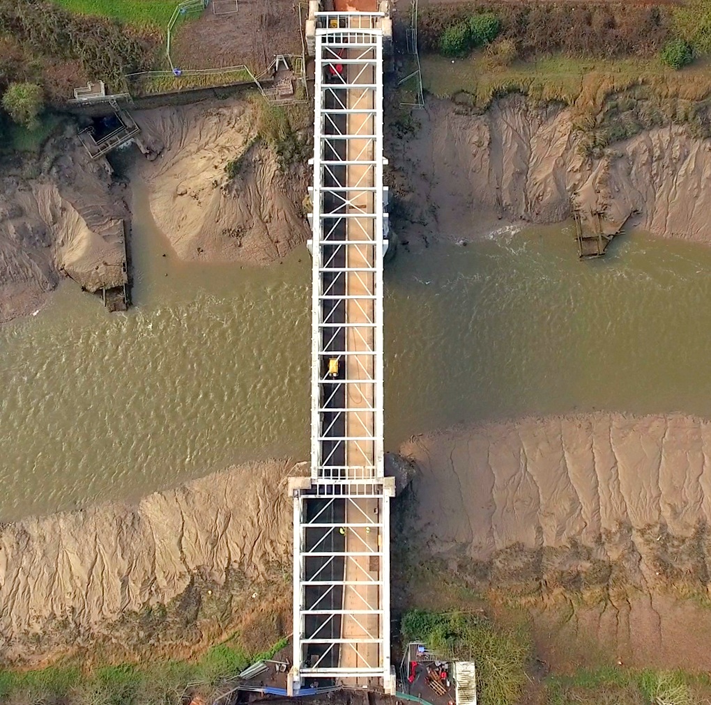 The bridge consists of two pairs of braced steel beams which are 36.26m long and each weigh 70 tonnes.