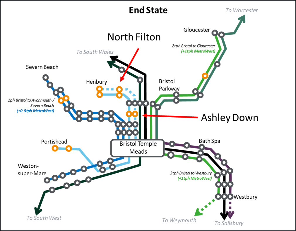 - Henbury Line: Re-opening of the Henbury Line with new stations at Henbury, North Filton and Ashley Down, providing an hourly service from Bristol Temple Meads to Filton Abbey Wood and onto North Filton and Henbury.