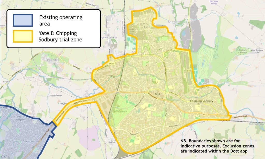 • E-scooters and e-bikes can be ridden to and from a wide range of locations across the operating area. Yate and Chipping Sodbury are connected to the main operating area via the A432 through Coalpit Heath and Winterbourne.