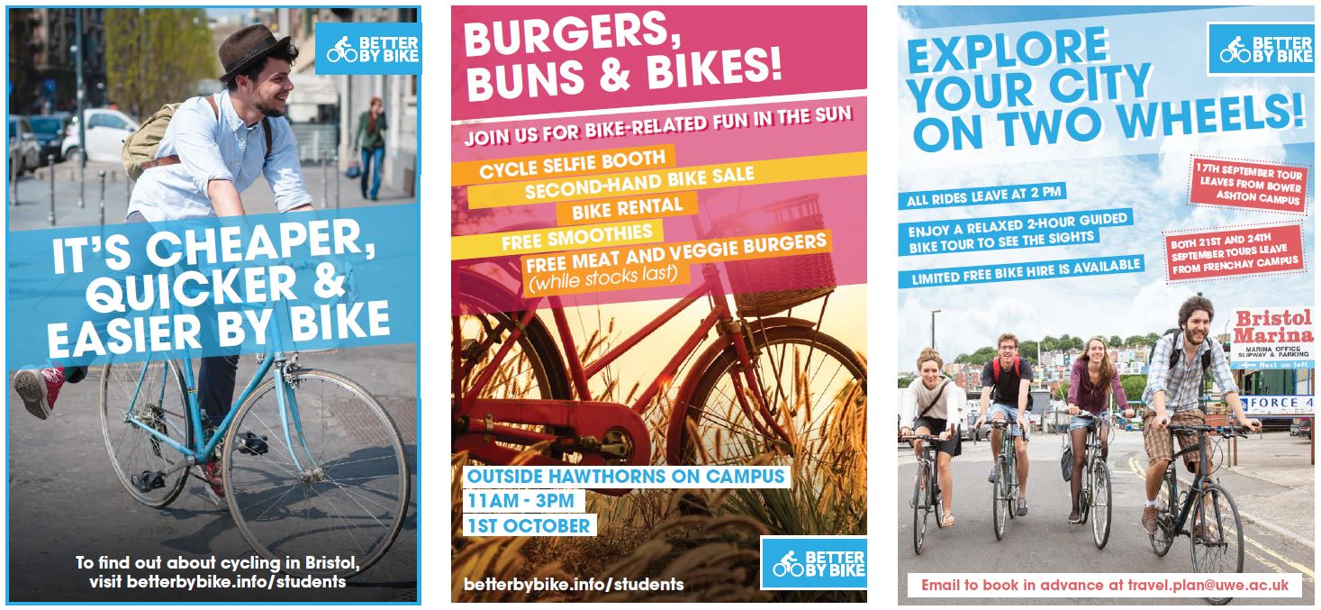 This section reviews the lessons learnt from the travel marketing campaign implemented at both The University of the West of England (UWE) and The University of Bristol (UoB) in 2014.UWE and UoB have contrasting levels of transport mode use. Given existing measures and the large number of students living within a 5km radius of university, encouraging the uptake of cycling was identified as the greatest opportunity.