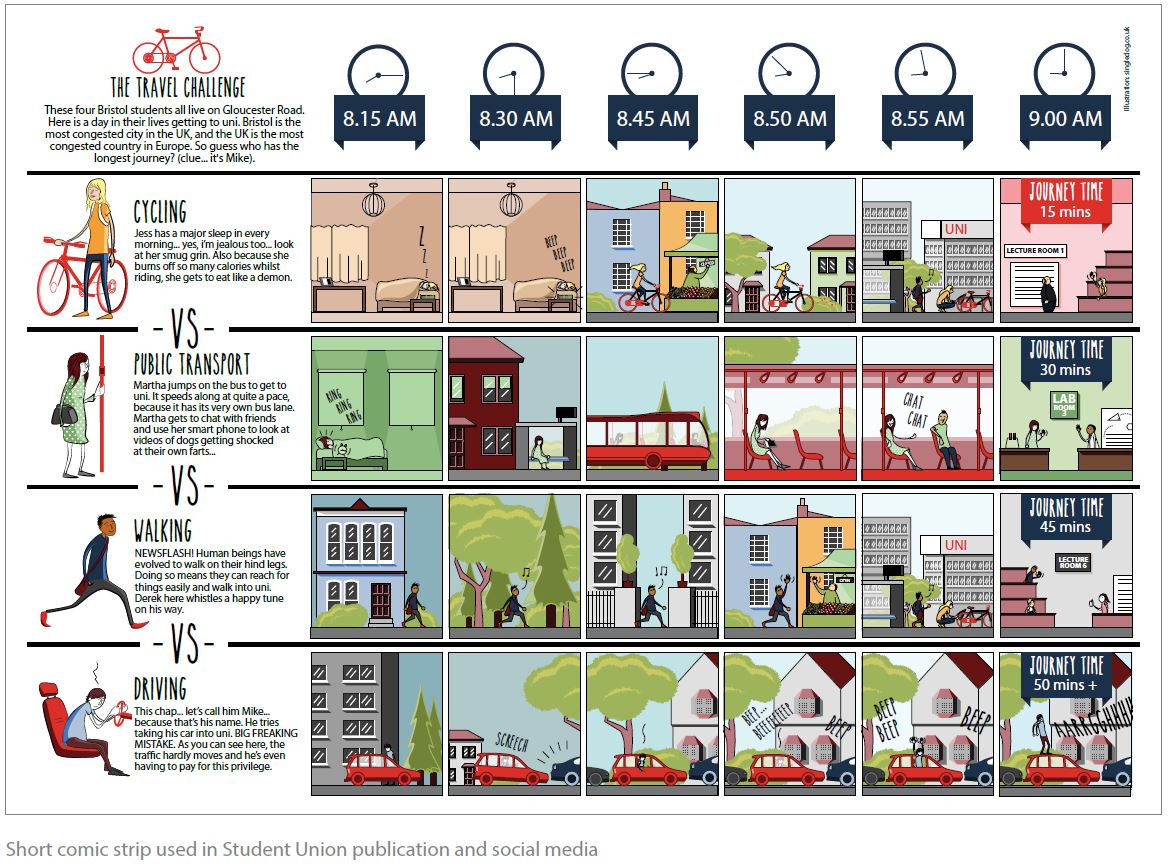 The below comic was created as an eye catching means of communicating the results of the annual commuter challenge – which is a race between commuters of different modes to Frenchay Campus. The challenge has been held for several years, with compelling results, but it has proved difficult to get the message out widely.